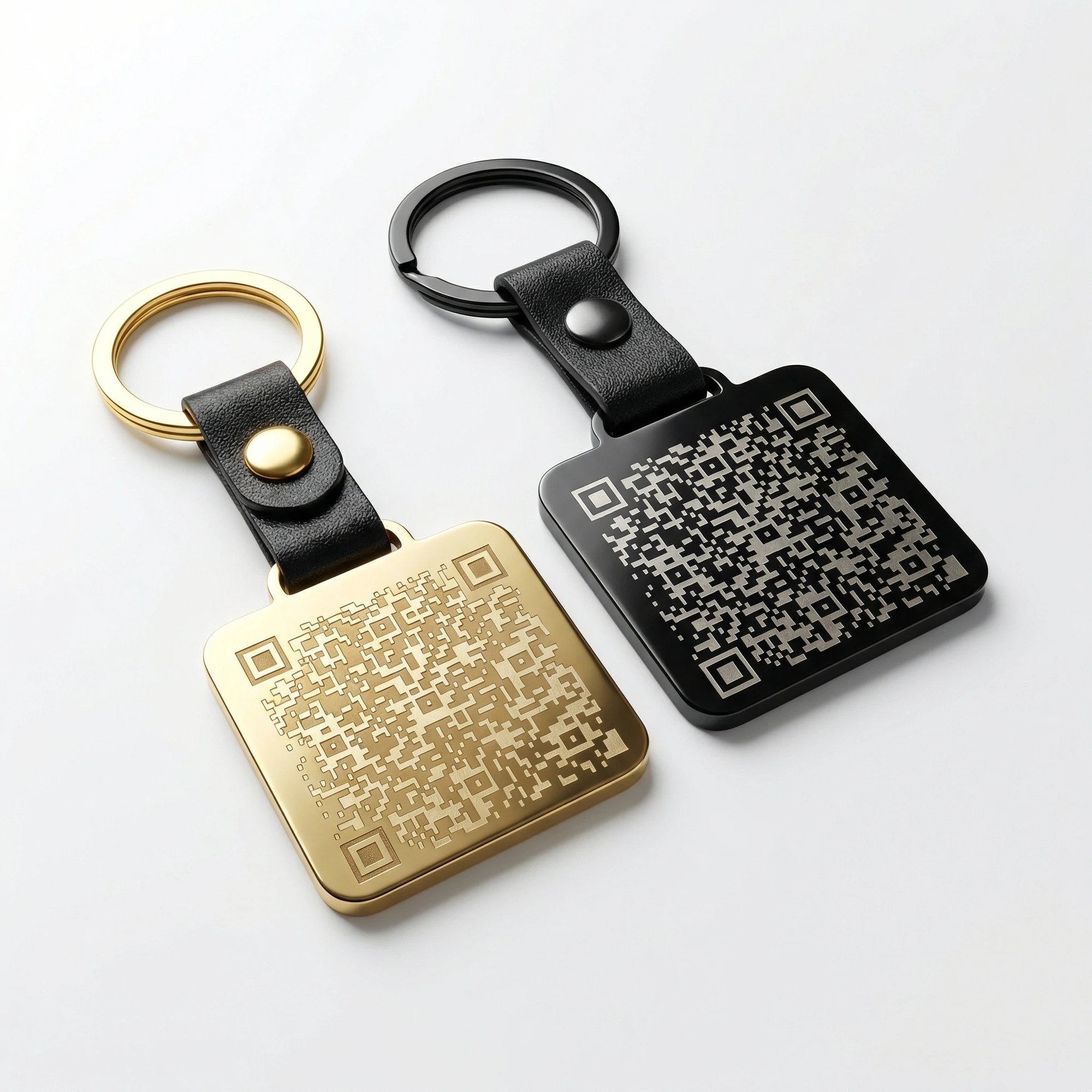 Un llavero metálico grabado con un código QR dinámico que conecta directamente c...